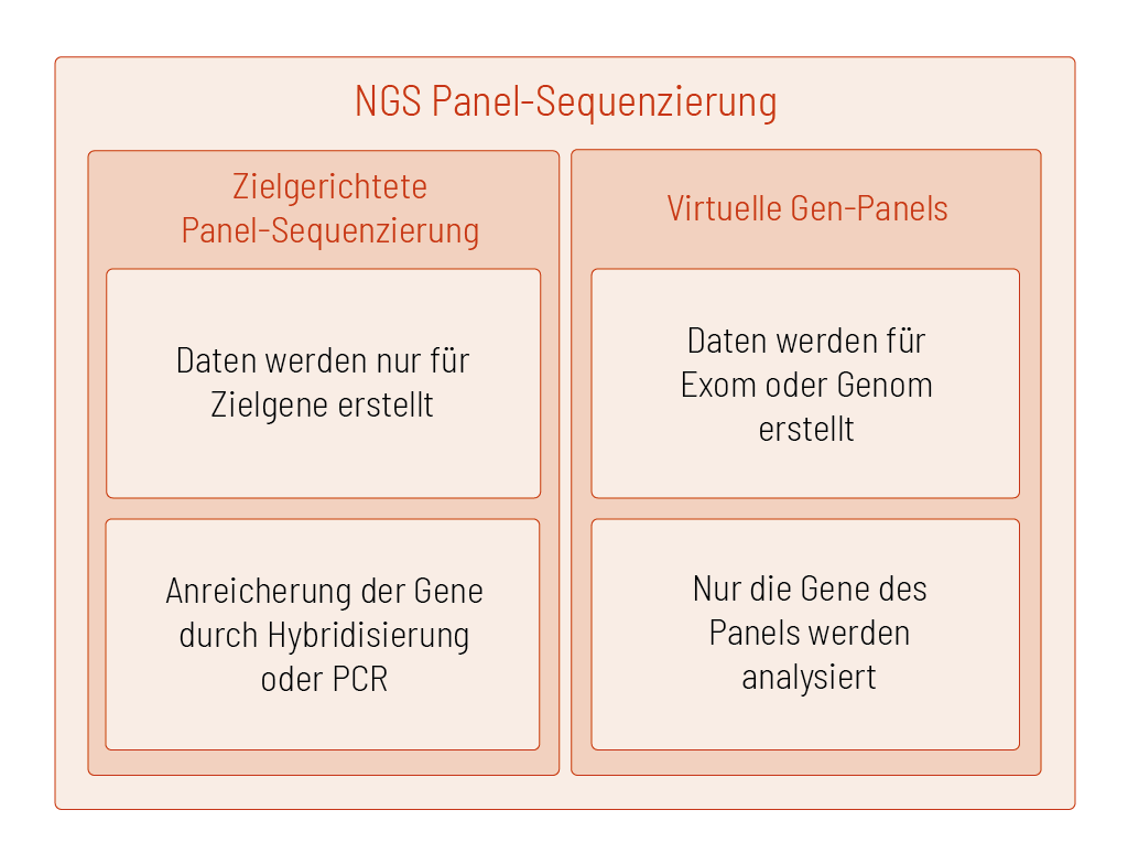 Bei der Panel-Sequenzierung wird ein vordefiniertes Set an Genen analysiert, das mit einer bestimmten Erkrankung, einem Syndrom, Phänotyp oder klinischen Symptom assoziiert ist. Abhängig vom Umfang des Panels kann solch ein Set an Genen zwischen zwei und über tausend Genen beinhalten. Dieses Set an Genen wird gleichzeitig sequenziert und analysiert. Nutzt man Next-Generation Sequencing (NGS) für die Panel-Sequenzierung, sind zwei Arten von Gen-Panels verfügbar: (|) die zielgerichtete Panel-Sequenzierung und (||) virtuelle Panels (siehe auch Abbildung 1).
