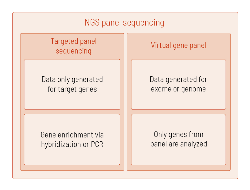 In gene panel sequencing, a predefined set of genes associated with a particular disease, syndrome, phenotype, or clinical symptom of interest is analyzed. Depending on the scope of the panel, this set of genes can comprise between two and over one thousand genes. This collection of genes is simultaneously sequenced and analyzed. When using next-generation sequencing (NGS) approaches for panel sequencing, two types of gene panels are available: (|) targeted panel sequencing, and (||) virtual panels (see also figure 1).